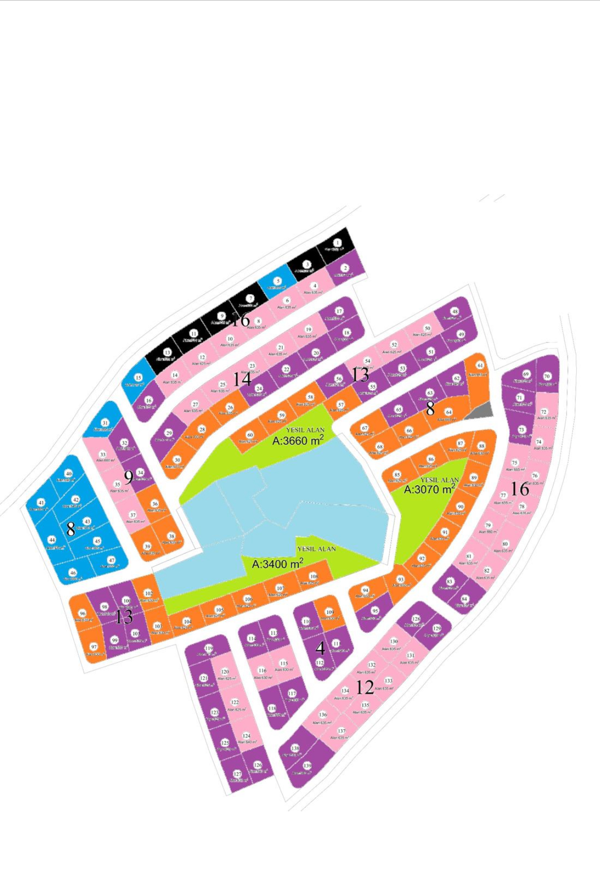 The net project area of 138 plots totaling G0.984 m² has been perfectly planned with road setbacks and arrangements.