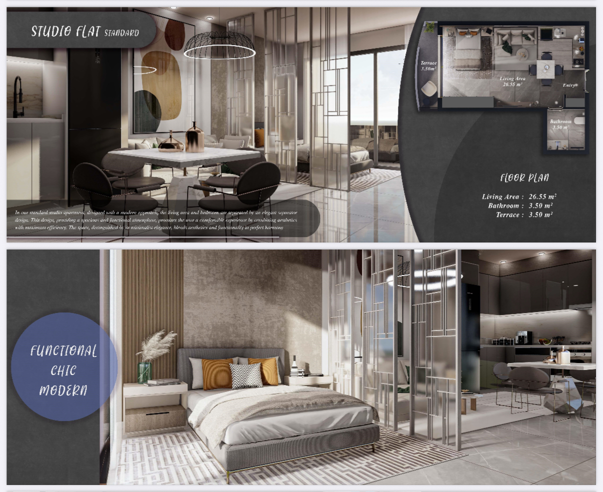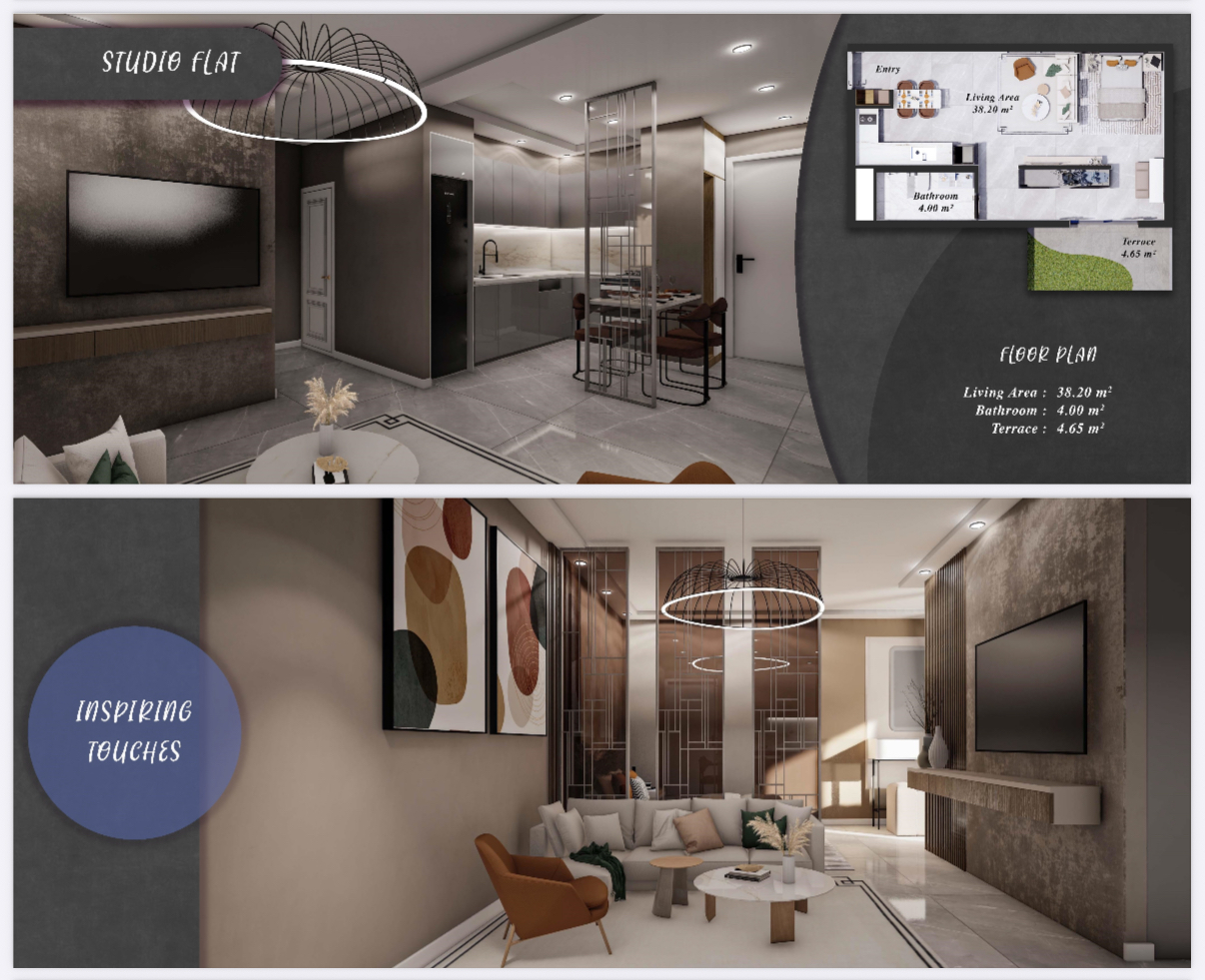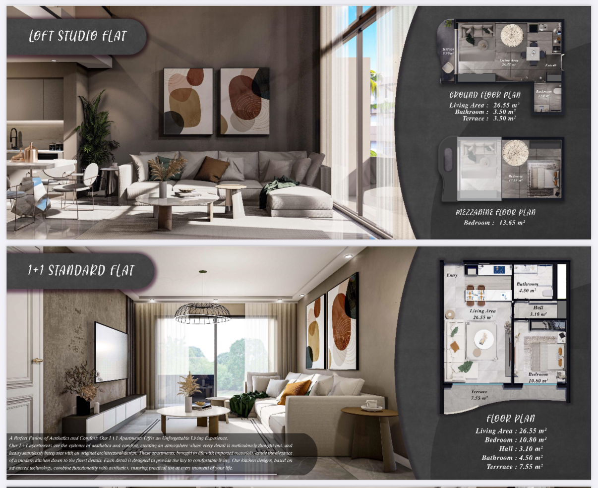 The six blocks consist of standard 1+1, 2+1, and studio apartments on the ground floors, while the upper floors feature loft and penthouse 1+1, 2+1, and studio apartments. In addition to these two different apartment types, there are also four bungalow villas.
