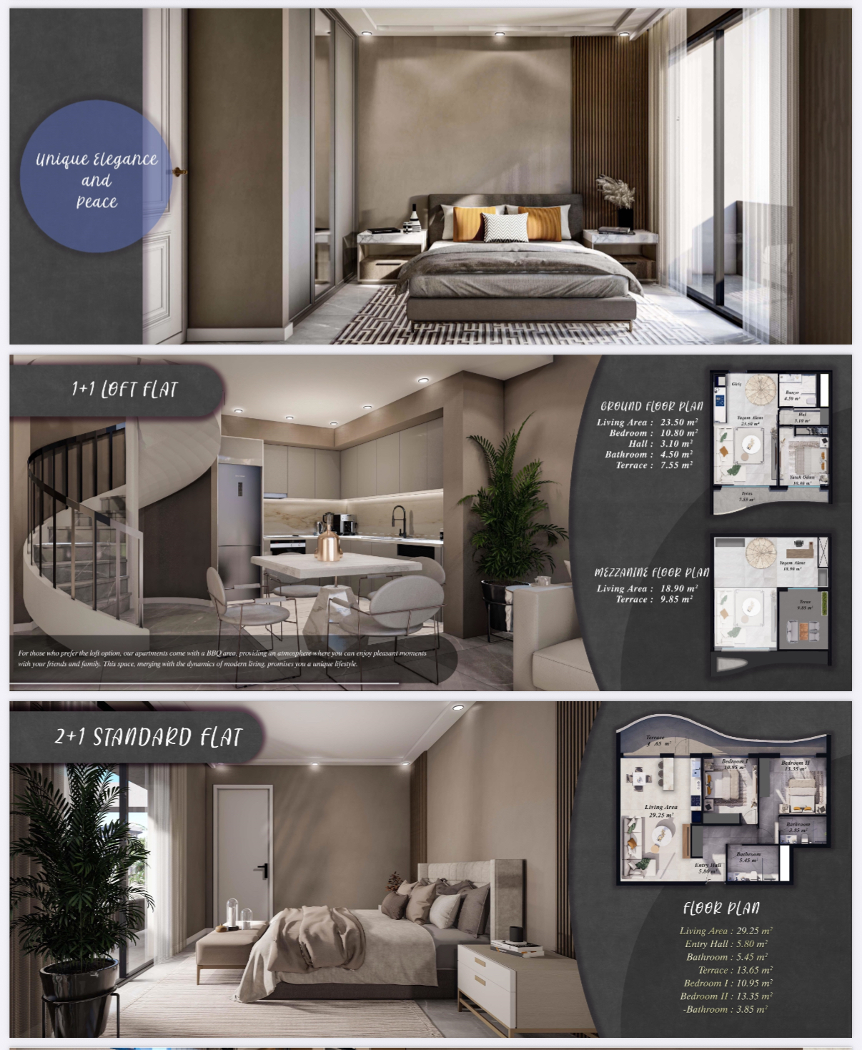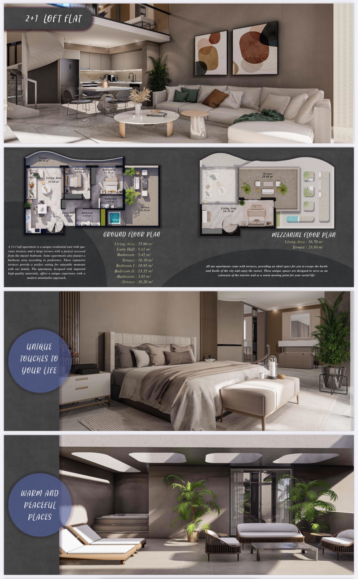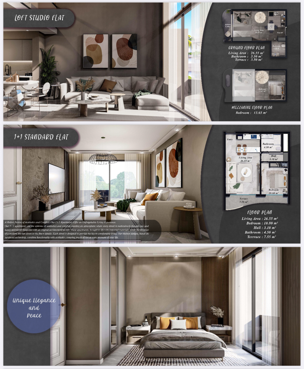 The six blocks consist of standard 1+1, 2+1, and studio apartments on the ground floors, while the upper floors feature loft and penthouse 1+1, 2+1, and studio apartments. In addition to these two different apartment types, there are also four bungalow villas.